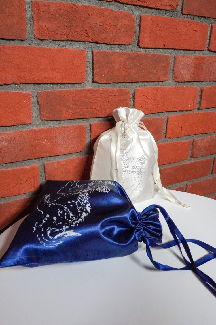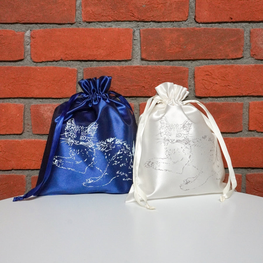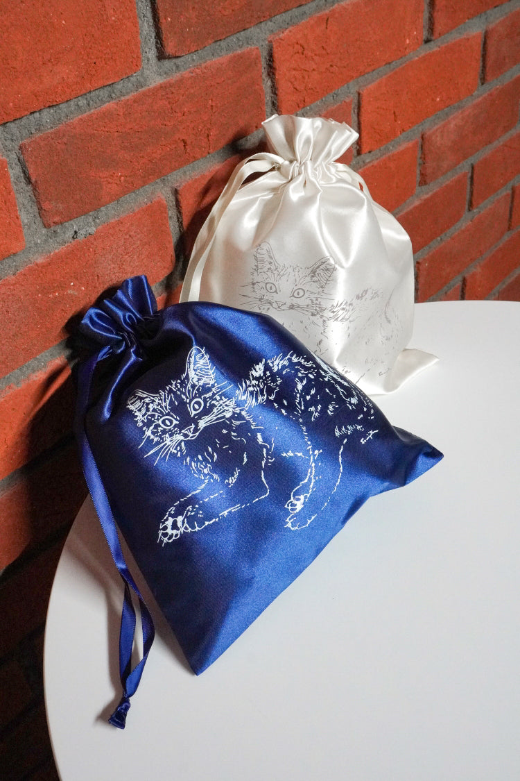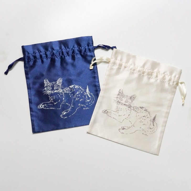 藤田が描いた愛らしい猫たちが、サテン地の巾着バッグに!